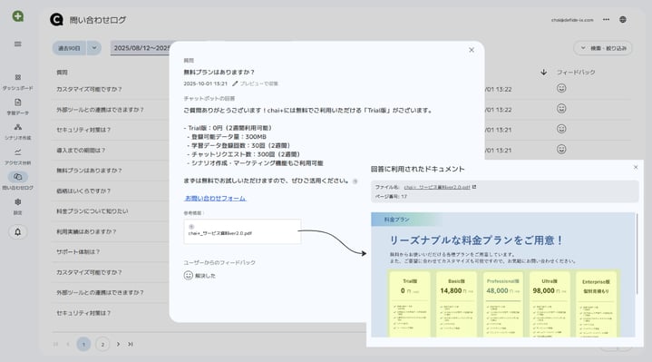 お問い合わせログにおいて、ドキュメントの参考情報を閲覧できるよう改善いたしました。
