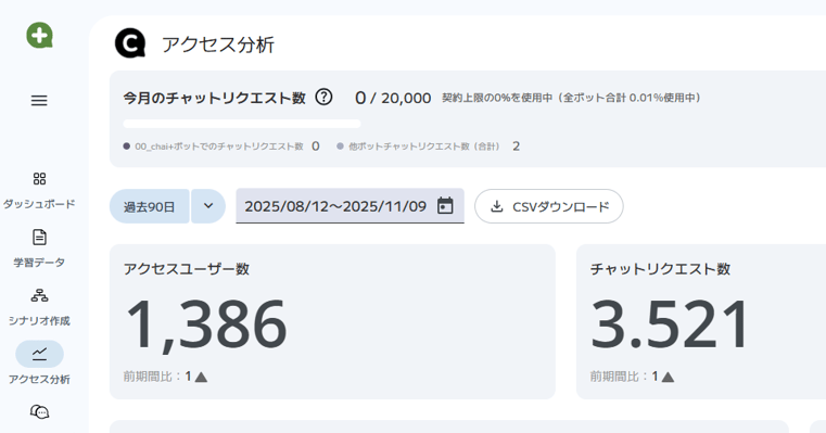 本機能により、「いつ」「何名が」「何回チャットリクエストを行っているか」といったデータを分析することが可能となります。ぜひご活用ください。
