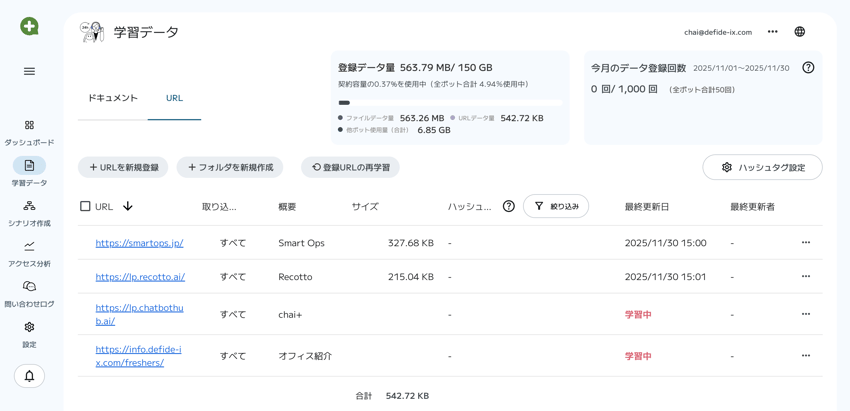 これまでは、各URLを個別に更新(再学習)する必要がありましたが、今回のアップデートにより、選択した複数のURLをまとめて再学習できるようになりました。作業効率の向上にぜひご活用ください。
