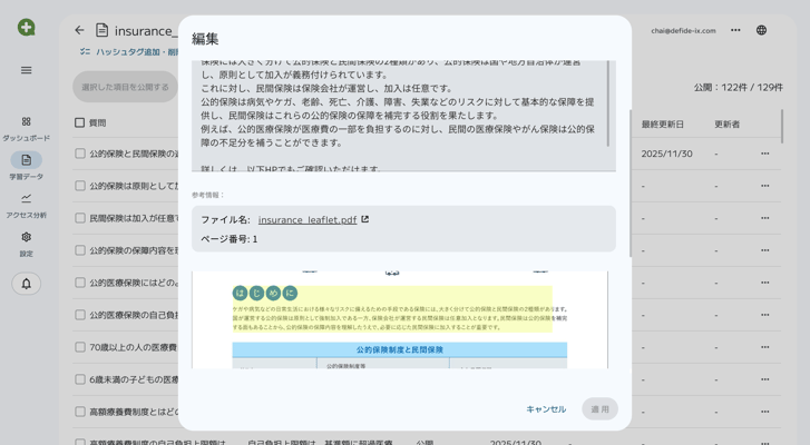 これにより、FAQの質問・回答セットが、ソース(ドキュメント/URL)のどこの内容をもとに生成されたかを一目で把握できるようになります。補足情報の追加や内容更新の際に、より効率的にご活用いただけます。