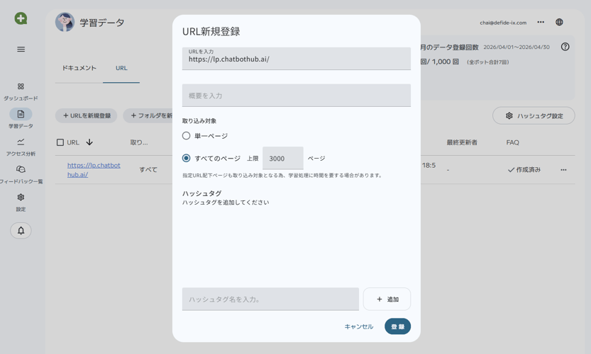 あわせて、URL学習における上限値(最大3,000ページ)について、対象範囲を明示的に設定できるUIを追加しました。これにより、学習対象のページ数を事前に把握・調整しやすくなります。